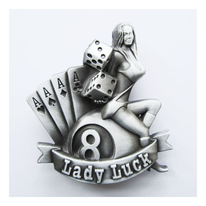 Boucle pin-up assise sur une boule de billard n° 8 , cette boucle est brut ( sans couleur )