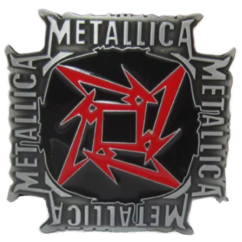 Boucle de ceinture du groupe de hard rock Metallica carré avec au centre la ninja star en rouge sur font noir.